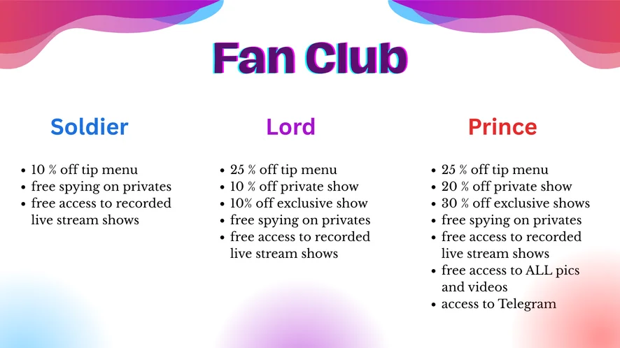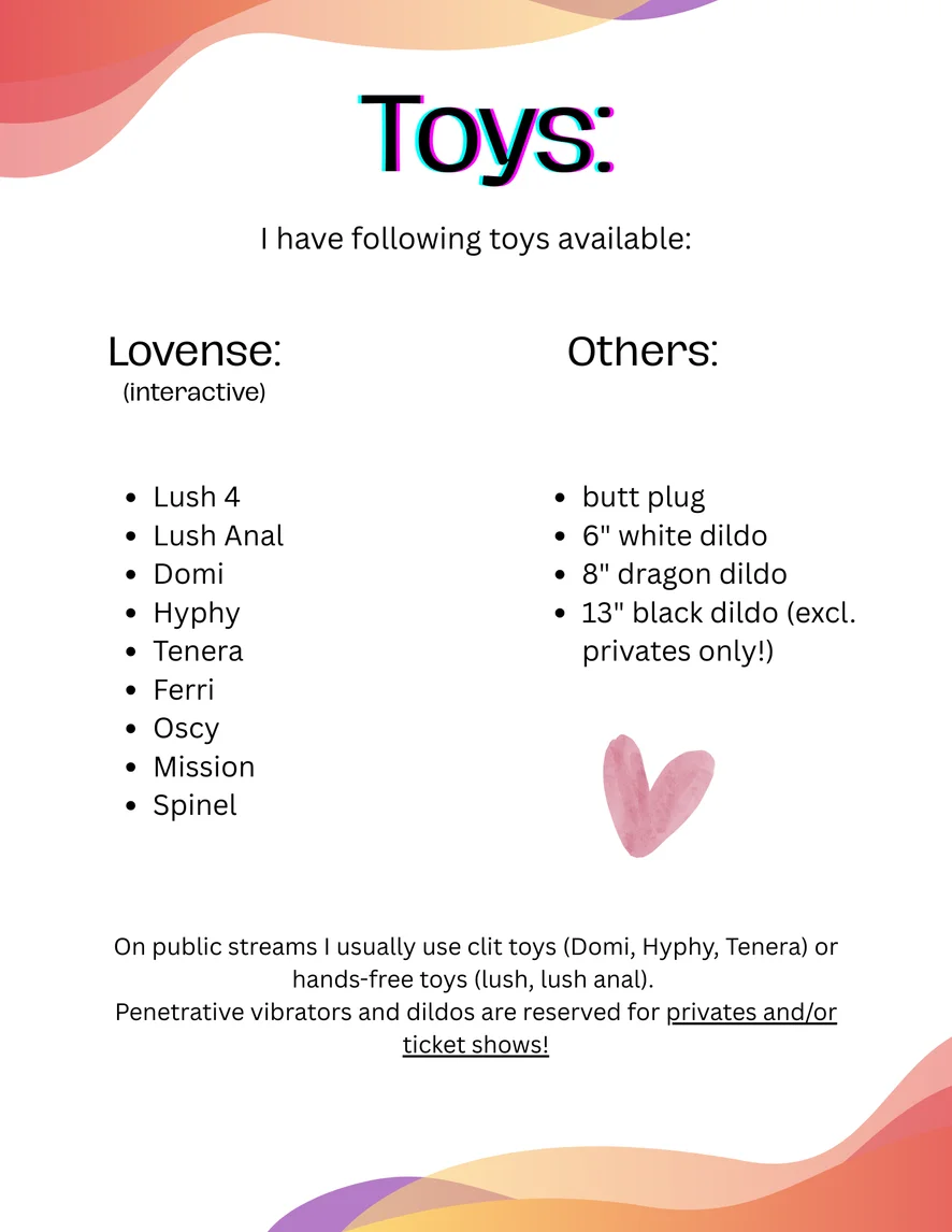 Above all: Please be understanding and read the room. If it's busy I may not be able to get to every tip request or PM right away! But I will get to all of it eventually. Respect that I give my time and energy to every tip item. You wouldn't want me to rush through your request just because someone else already tipped for the next thing, right? If you do not want to share me and want me all to yourself you can always request a private! Privates stay private and I will never post a recording of them for others to purchase. (Again, if the room is busy I might not be able to accept a private call right away, while I am in the middle of a toy control or specific tip request!)